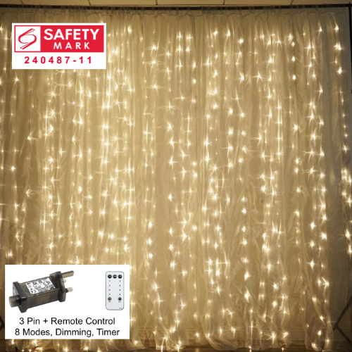 Create a cozy and magical atmosphere with this SG Safety Mark-certified 31V LED Fairy Curtain Light. Measuring 3 meters wide and 3 meters in drop length, it features 300 warm white LEDs across 10 cascading strands. Designed with transparent wires and 8 lighting modes with memory function, it adds a warm, elegant touch to bedrooms, weddings, events, or festive decor. Safe to use, energy-efficient, and extendable up to 2 sets in series.
